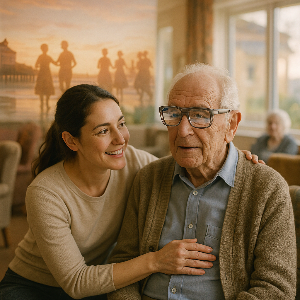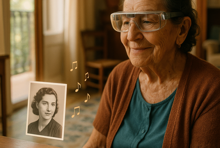No és realitat virtual, no tanquem els ulls al món, sinó realitat augmentada: la persona continua veient l’entorn i les persones al costat, i hi apareixen elements digitals sobris i clars que conviden a reconèixer, a somriure i a conversar. El moviment suau, balanceig, passos asseguts, petites seqüències de ritme, actua com a pont entre el cos i la memòria: una manera de respirar millor el record, de calmar l’ansietat i de teixir complicitats entre residents, famílies i professionals.